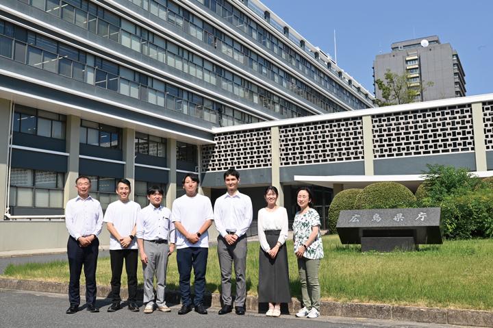 リスキリングを推進する広島県商工労働局人的資本経営促進課の職員。広島県庁前にて