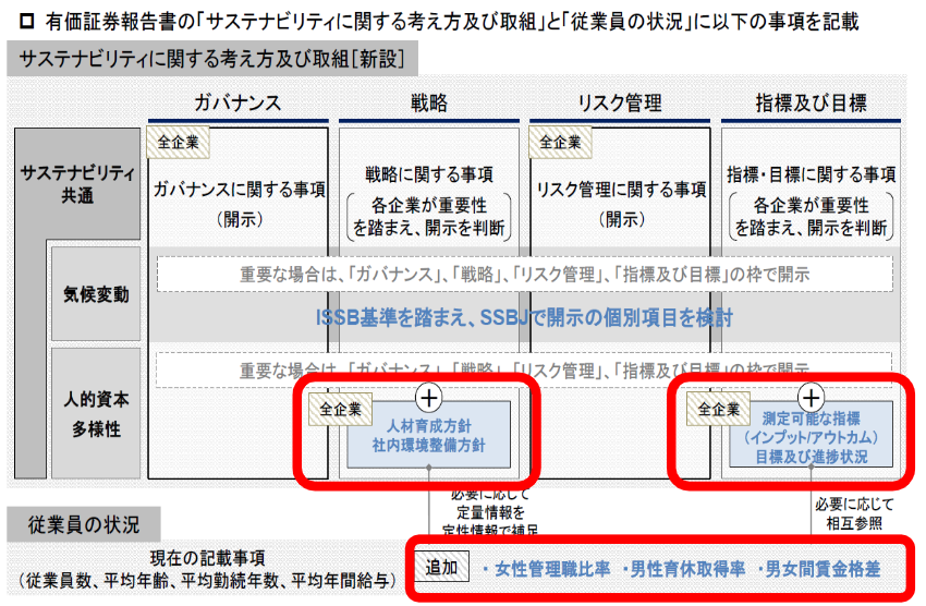 下図の赤枠項目の人的資本情報の開示が義務化されました。