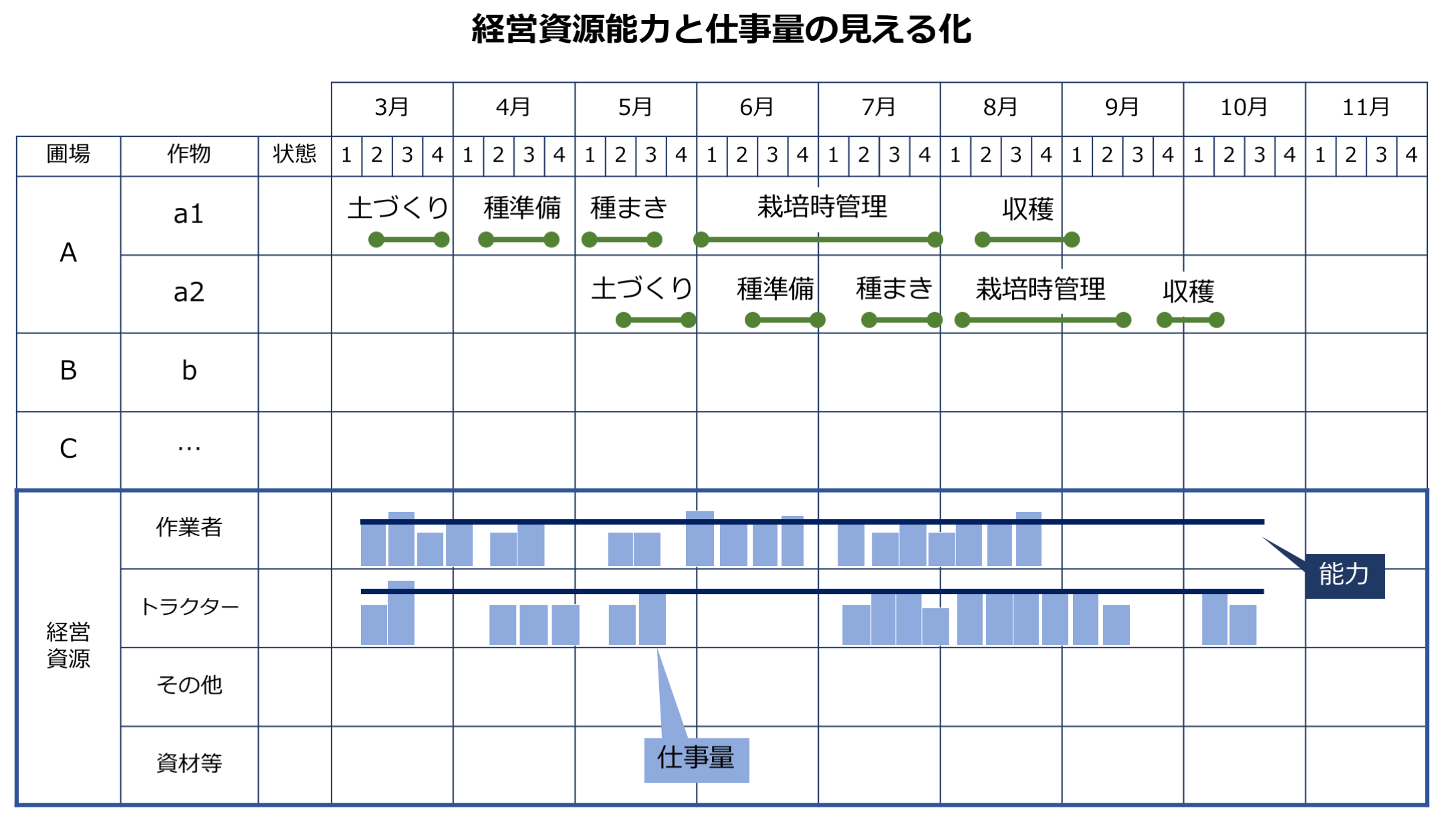 農業は変動する仕事量に対応して、適切な経営資源を配分することが難しい産業である。経営資源を過大に保有すると固定費が収益を圧迫することになるし、経営資源の能力を考慮して安易に作付けを減らして調整すると、売上高減少で収益性が低下することになる。