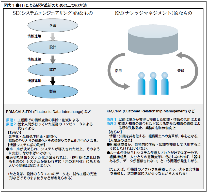 SE的な経営革新は、情報の電子化により、ワークフロー化が進み、効率化・品質の低下防止・即時化などが実現される。情報のやりとりを標準化したり、それをシステム化することが革新の中心となる。つまり、コンピュータ導入によって効率化が図られるのである。一方、KM的な経営革新とは、コンピュータを導入しただけではうまくいかない。情報共有化のためにグループウエアやウエブシステムに投資したものの、データベースには閑古鳥が鳴いているという状況は、まさにこのKM的なものの特性が認識されていないのである。KMの場合、全員が知識や情報を提供し、検索・活用しないと、その成果は生まれない。