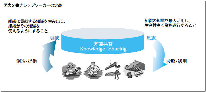 KMを推進するうえで、思想的なバックボーンとなるのはP.F.ドラッカーが『プロフェッショナルの条件』などで指摘した“ナレッジワーカー(知識労働者)”の定義による。詳しくはドラッカーの著書を読んでいただければよいが、ナレッジワーカーを簡単に定義すると以下の2点に集約されよう。①組織の目的に貢献してはじめて成果になる②自分の成果を他の人間に供給することに意味がある図表2で示すように、ナレッジワーカーとは職種によらず、日々の仕事のなかで、組織にとって意味ある知識を生み出し、それを共有化するように努めることで組織に貢献する。また、共有化された知識を利用して、業務遂行において高い生産性を実現する。