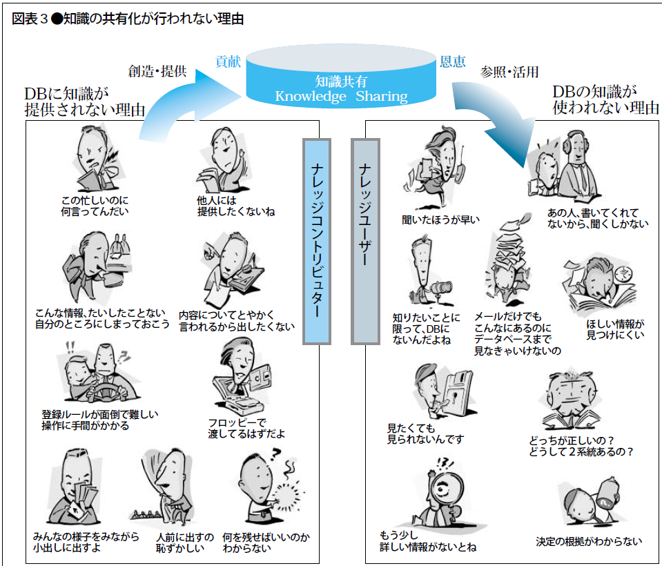 ITツールが導入され、経営トップのナレッジマネジメント推進の掛け声も出されている。それにもかかわらず、なかなか情報共有化がうまくいかないという実態を考察してみたい。図表3は、ナレッジコントリビューターとナレッジユーザーのそれぞれの立場で、情報登録しない理由、情報活用できない理由のうちの代表的なものをあげた。程度の差こそあれ、このような理由が、ナレッジマネジメント推進の障害になっているといえよう。これまでに述べてきたとおり、ナレッジマネジメントというのは、情報システム系の刷新ではなく、人間系の変革、すなわちマネジメントの仕事と認識すべきである。