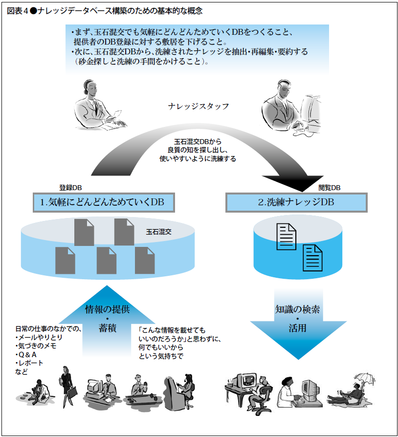 まずは、登録データベースに情報を蓄積する。筆者のコンサルティング先の企業では、社内では仕事のeメールは原則禁止とし、仕事のやりとりはグループウエアであるNotesのデータベース上で行うルールにしている。そのような行動を推奨することで、情報の質はともかく、とにかく素情報は残ることになる。しかし、この登録データベースは、“玉石混交”の情報で、そのままの状態では検索・閲覧するには適さない。そこで、登録された第一次情報のうちから、ナレッジスタッフによって良質のナレッジだけを抽出し、閲覧データベースに登録する。閲覧データベースは、洗練された知識、情報の宝庫であるので、ナレッジユーザーにとっては、使いやすいものになる。ただ単に登録データベースから良質の知を見つけ出すだけでなく、定期的に過去情報の要約やダイジェストをつくったり、個別事例をもとに普遍的知識としてまとめることも、知を洗練することになる。それゆえ、この登録データベースのさまざまなレベルの情報を覗き、それを洗練された閲覧データベースに登録していく役割を果たすナレッジスタッフを置くことが望ましい。