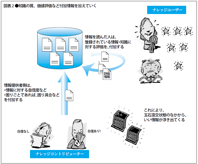 また、組織内で一目おかれているようなベテランが、DBの情報に対して「これはいい」とコメントすることで、提供した若手スタッフが多くの人に注目されるということもある。何もコメントがなければ埋もれてしまいかねない情報が、こういうコメント一つによって浮かび上がってくる。このように、ナレッジマネジメントにおいては、ナレッジユーザーが、知識・情報を評価しながら、多くの知識・情報のなかからすぐれたものを際立たせていく仕組みが重要になる。