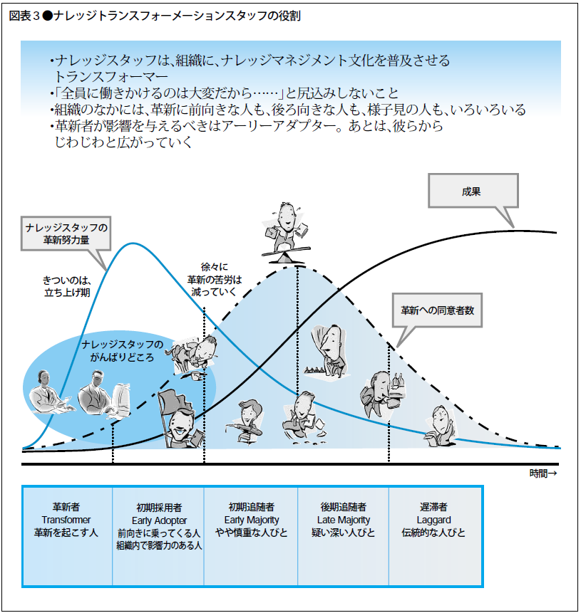 ここまで述べてきたように、ナレッジマネジメントというのは、情報システムを入れるだけでは不十分で、その後のさまざまな工夫や仕掛けが重要である。いくらかの“手間”をかけないことには、なかなか革新はうまくいかない。では、革新を推進する立場にある人間は、どのような心構えを持てばよいのであろうか。繰り返しになるが、人間系の意識の革新がナレッジメントの本質である。図表3に示すように、変革においては、変わることに前向きな人間もいれば、保守的な人間もいる。革新を進めるうえでは、保守的な人をいかに説得するかを考えるよりも、前向きな人を中心に変革の波を起こし、様子見の人びとを前向きな態度に変えていくほうがよい。ナレッジマネジメントを推進する人をナレッジスタッフと呼ぶならば、図表3のように、ナレッジスタッフは、変革に対して早期に賛同してくれるアーリーアダプター(初期採用者)を仲間に巻き込むことにエネルギーの大半を使えばよい。