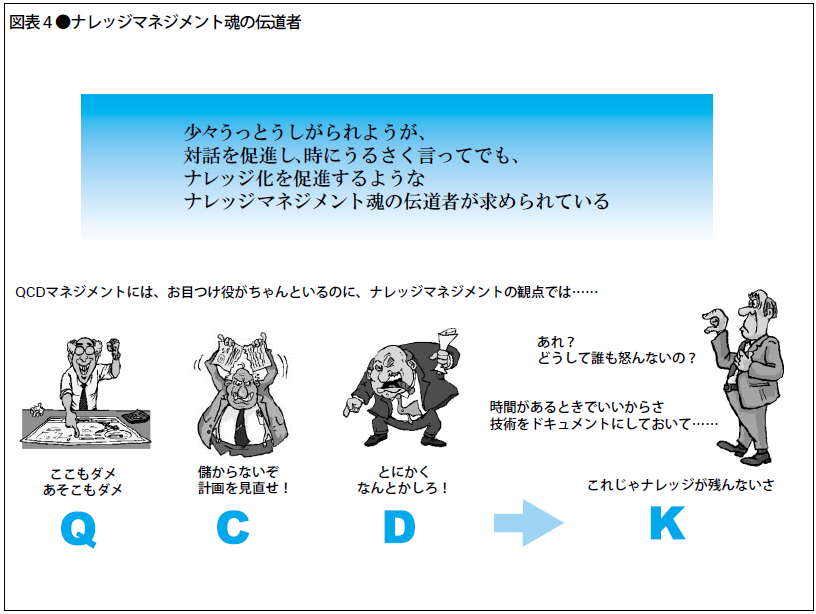 現在、ナレッジマネジメント推進者は、少々遠慮がちに「時間があるときでよいから、知識を残してね」と言うことが多い。これではなかなかナレッジは蓄積されていかない。必要なものは、ツールや方法論に加えて、ナレッジマネジメント魂の伝道者なのである。少々うっとうしいと思われようと、知識創造のための対話を促し、ときに侃々諤々の議論をし、ナレッジ化を促進するような人材が重要なのだ。実際、こういう役を買って出る人びとが、各社に現れ始めている。