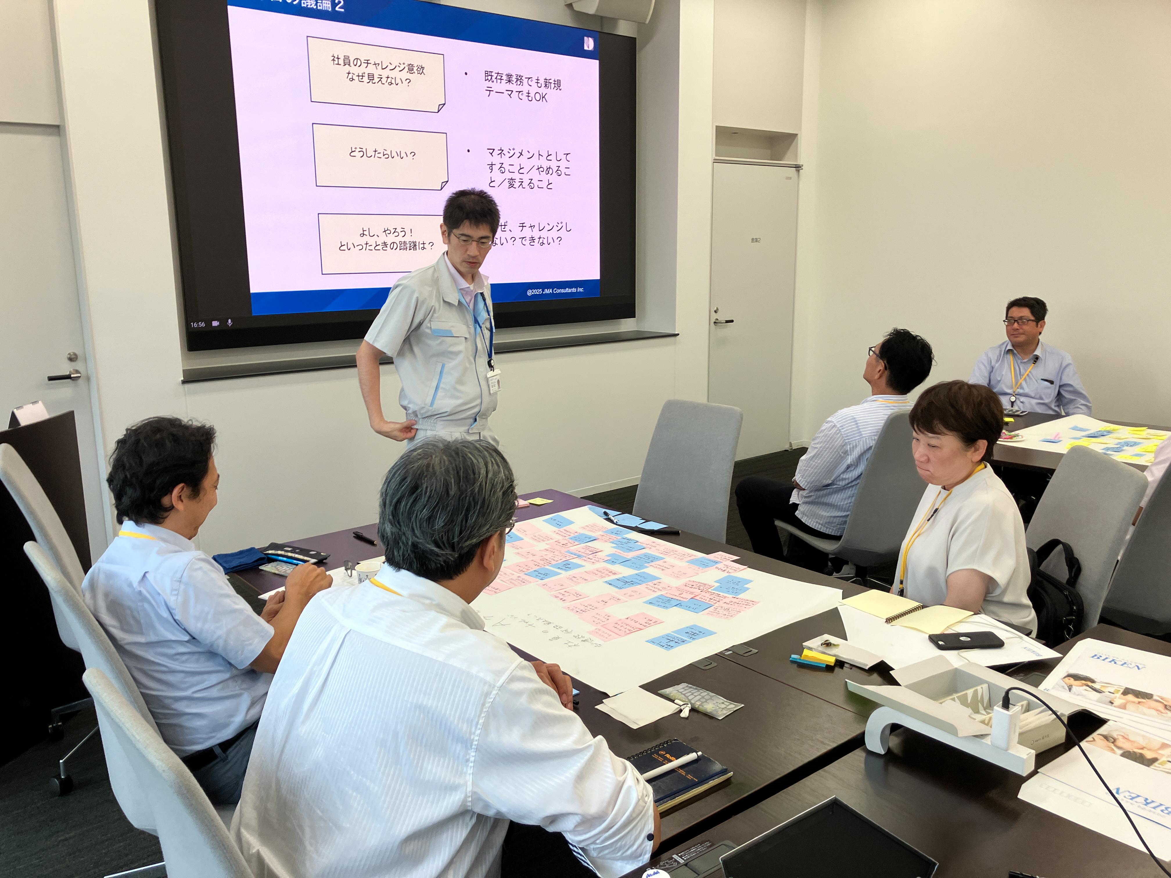 先の課題共有や問題提起をふまえ、「社員のチャレンジ意欲がなぜ見えにくいのか」「それに対してどのような施策が考えられるのか」についてディスカッションを行いました。議論は「そもそもなぜチャレンジ意欲が生まれないのか」という点にまで及び、世代の問題や評価制度、マネジメント層とのコミュニケーションなどが議題にあがりました。