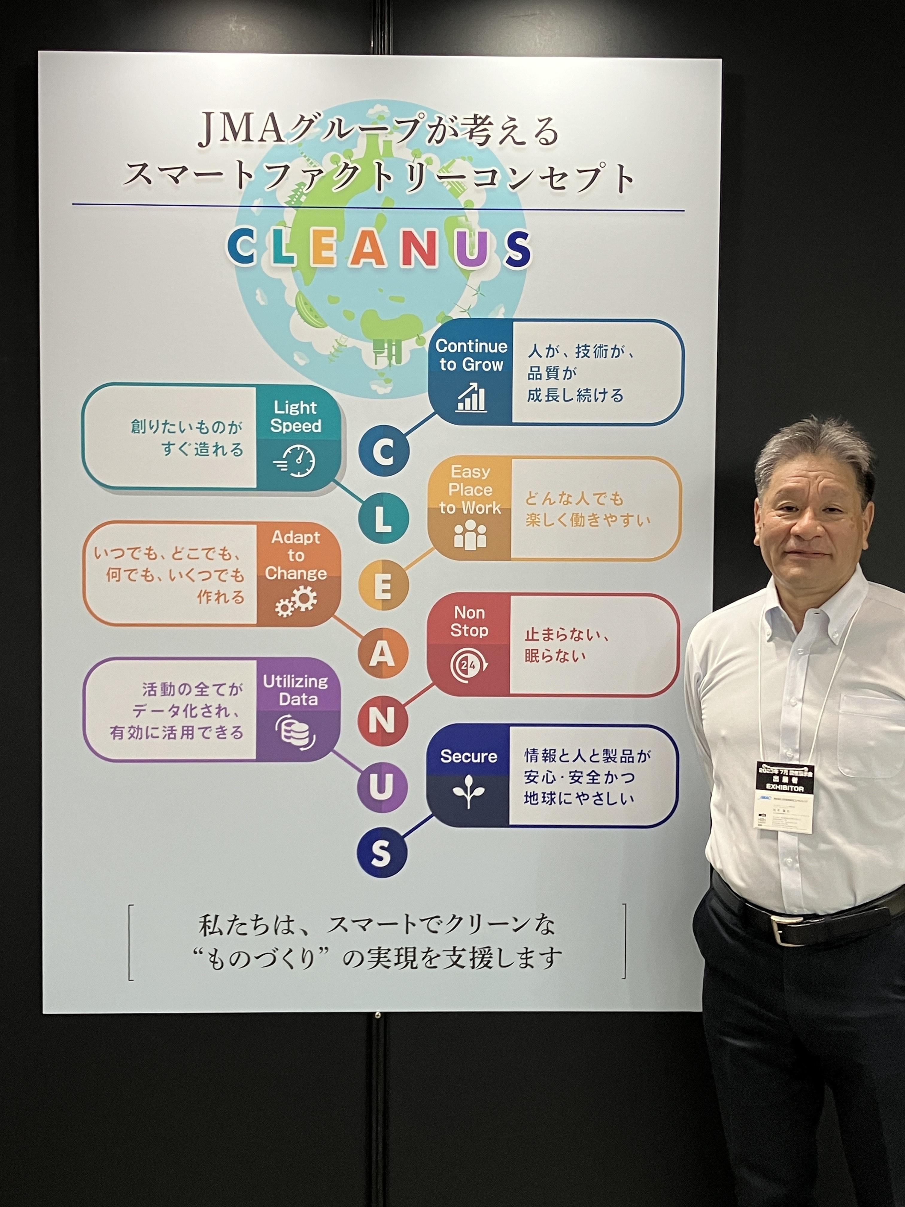 JMAグループでは、スマートファクトリーのコンセプトとして「CLEAN US」ということで次の7つのポイントを定め、スマートファクトリーのコンセプトと事例のパネル展示をいたしました。