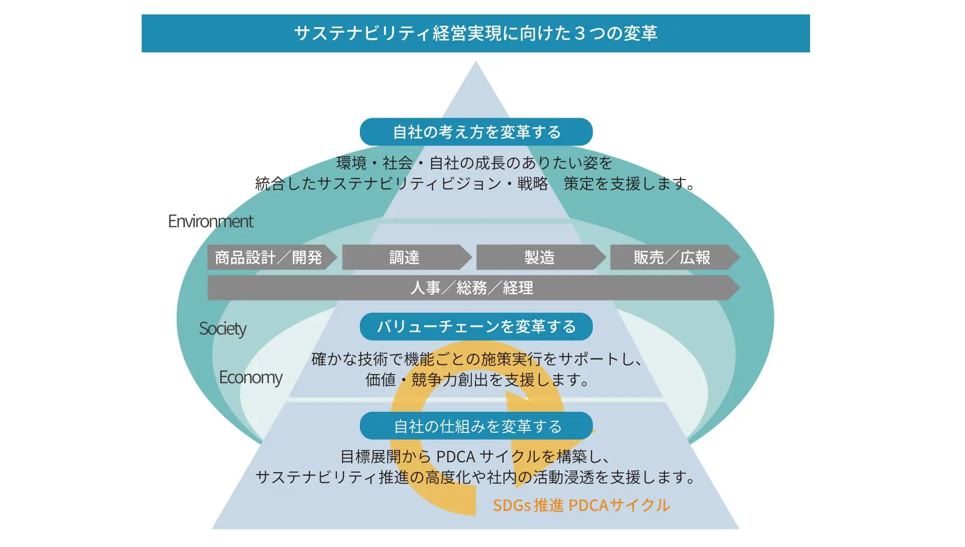 こうした状況を鑑み、今こそ、あらためて日本企業の強みを活かし、日本らしいサステナブル経営によって、日本の発展を目指し、世界をリードすべき時ではないでしょうか。JMACは、SXを、社会・環境価値と経済価値を一挙両立し、ステークホルダーから常に支持され応援される企業・組織への変革と捉え、支援を行っています。