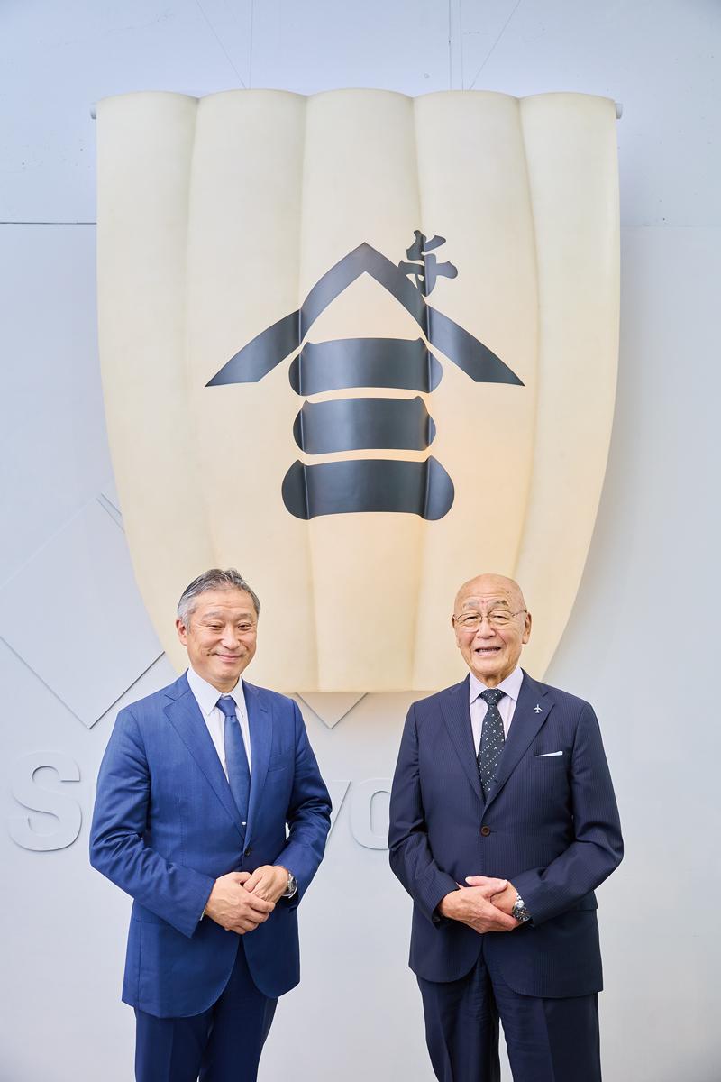 JMAC代表取締役社長・大谷羊平と。背後の商標は「播磨屋与平」創業時に使用されていた「やまさんよ」