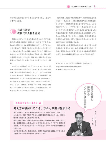 の日々の取り組みです。 「A Newの1枚を創る」これが私 技術やドキュメントがス JMACには多くのコンサルティング ルタントが残した素晴らし トックされています。先輩のコンサ も、自分なりの「1枚」を い財産やノウハウを大切にしながら ルタントとして成長するた 創り出すこと、それがプロのコンサ めに不可欠だと考えています。 様々な気づきや出来事をメ 日々のコンサルティング現場での 裏に焼き付けることも意識 モに残すとともに、そのシーンを脳 シーンをベースにドキュメ しています。こうして貯めた情報や 提示する訳ですが、私はこ ントとしてアウトプットしお客様に 。 のプロセスが非常に楽しく好きです 出てこないこともありま 」が もちろん、なかなか「A New
